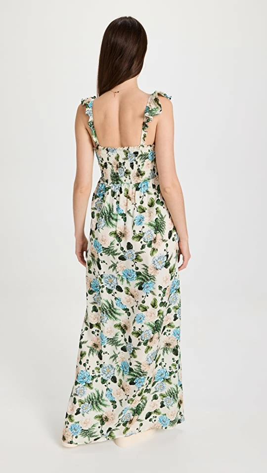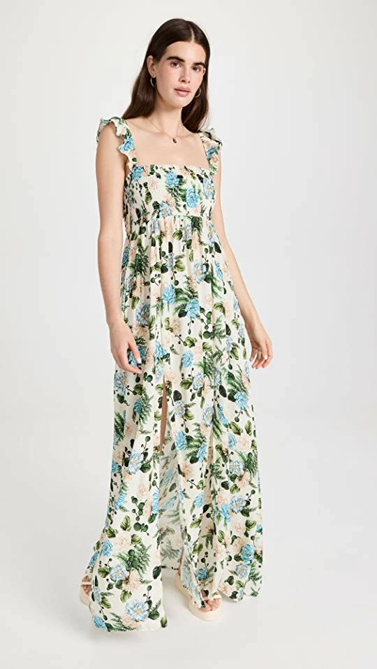 Toned-down tropical style is the name of the game with this Agua Bendita Leandra cover-up dress. This piece features a lovely illustrated print set against a bright-white background, and is designed with a classic empire silhouette. A deep front slit relaxes the hem.