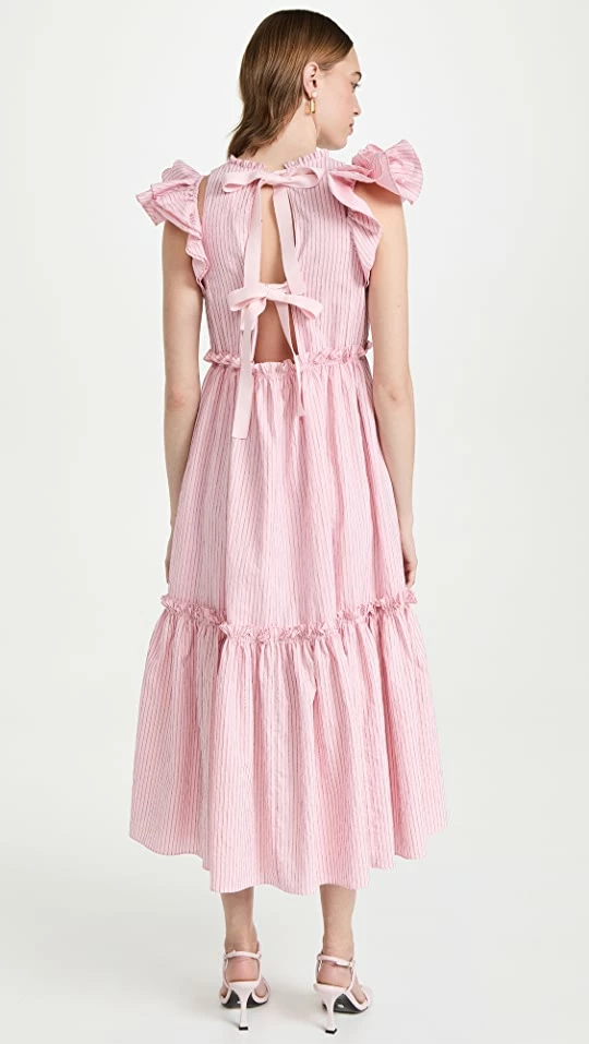 A lightly colored Cinq a Sept dress with day-to-night potential, embellished with pleats, ruffles, and pinstripes. Add a comfy pair of flat sandals to complete your outfit.
