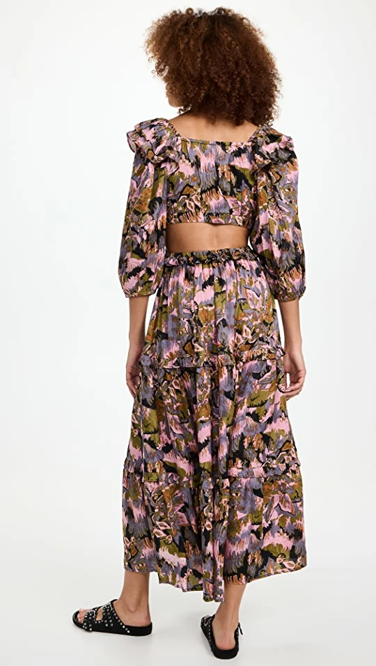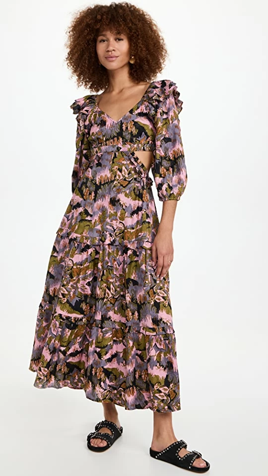 Intricate patterning in a dark color scheme draws the eye to this Cleobella Paris dress, which gains a touch of of-the-moment style from a wraparound cutout at the waist. Soft ruffles at the shoulders provide a romantic finishing touch.
