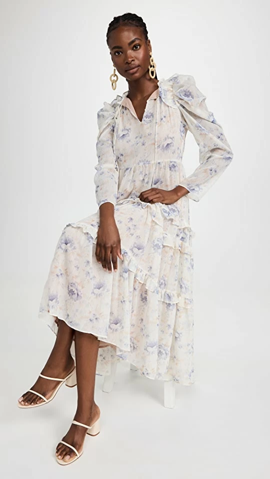 Dreamy patterning, lovely ruffles, and soft gathering embellish this romantic En Saison midi dress, a charming choice for days and nights alike. Wear yours with the heeled sandals of your choice.
