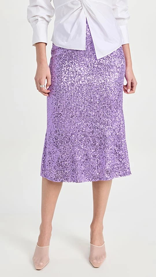 A traditionally proportioned English Factory skirt gets an eye-catching upgrade, courtesy of allover sequins. Dress this piece up with a silk blouse and heels, or keep things casual in a graphic sweatshirt and combat boots.