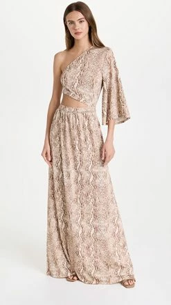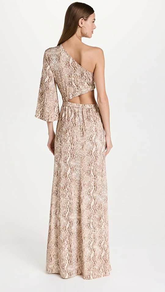 - One-shoulder neckline with single, 3/4 bell sleeve