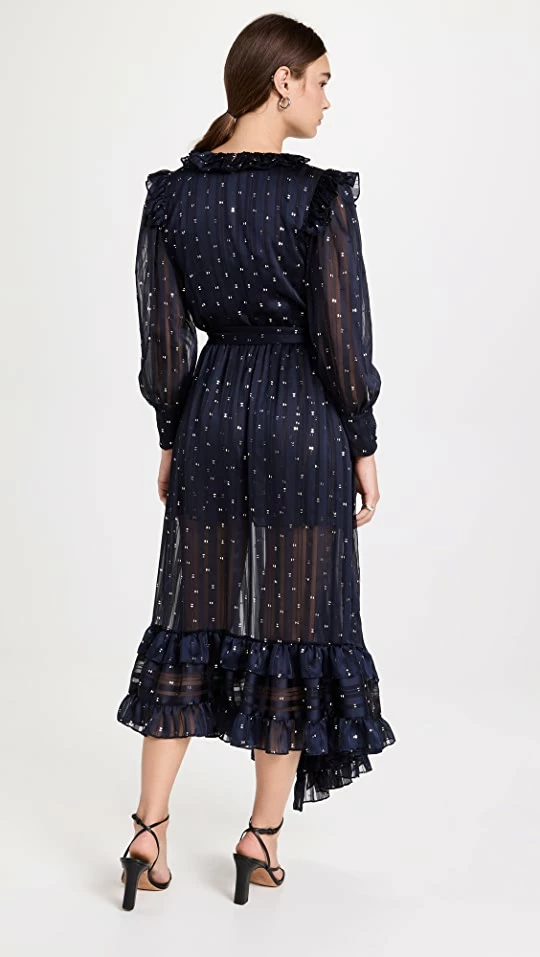A special-occasion piece par excellence, fresh from MISA. Crafted from feather-light, silky fabric, this sweeping maxi dress is embellished with metallic flocking and ruffles throughout the silhouette. Round out your outfit with a dark pair of heeled sandals.