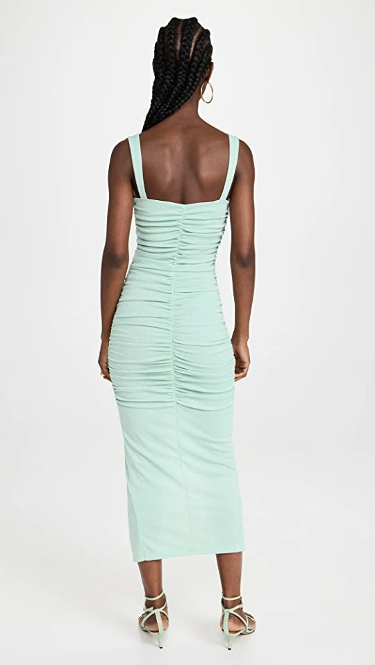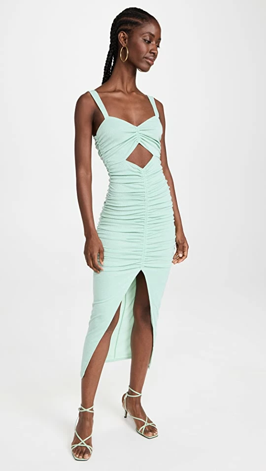 A picture-perfect night-out silhouette, this figure-skimming Saylor dress features an angular cutout, fluid ruching, and a deep front vent. Round out your look with heeled sandals.