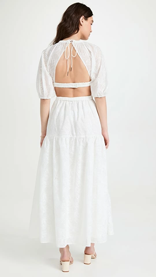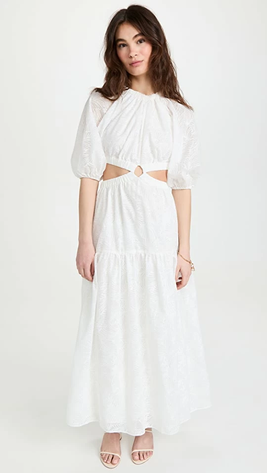 A monochrome and eye-catching Significant Other dress, featuring a two-piece silhouette trimmed with ruching and a covered ring accent at the waist. Just add simple heeled sandals to complete your outfit.