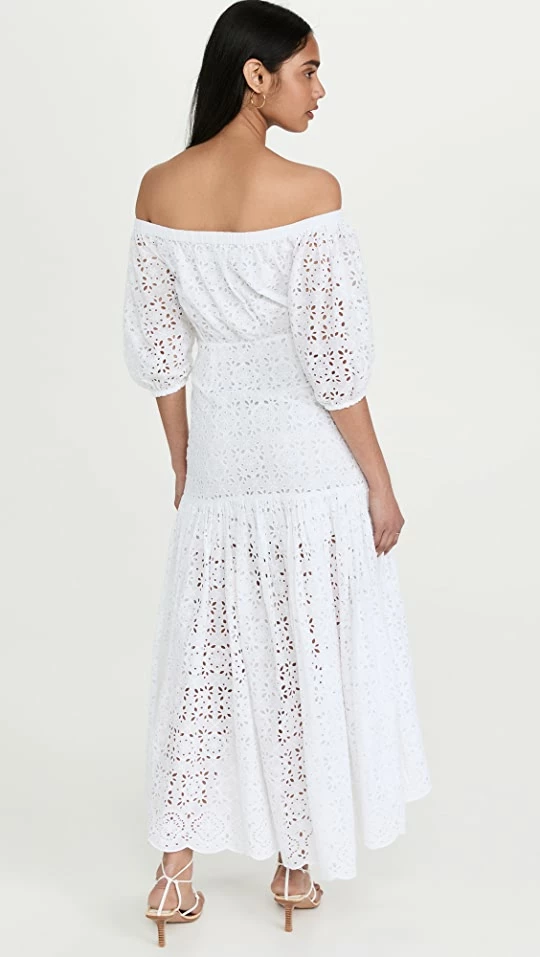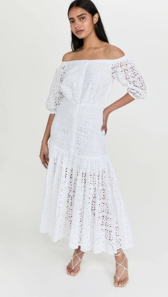 A picture-perfect summer style, this voluminous Veronica Beard dress is crafted from bright-white, all-cotton eyelet, and features an off-shoulder silhouette. Wear yours with a tonal pair of strappy sandals, and accessorize with gold-tone jewelry.