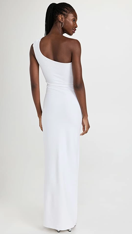- Asymmetrical ruched side seams and thigh-high skirt slit