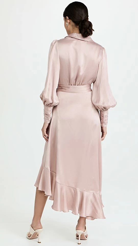 Zimmermann’s take on the classic wrap dress flows in luxe silk charmeuse finished with a ruffled high-low hem. Pair with a strappy sandal and simple jewelry for your next special occasion.